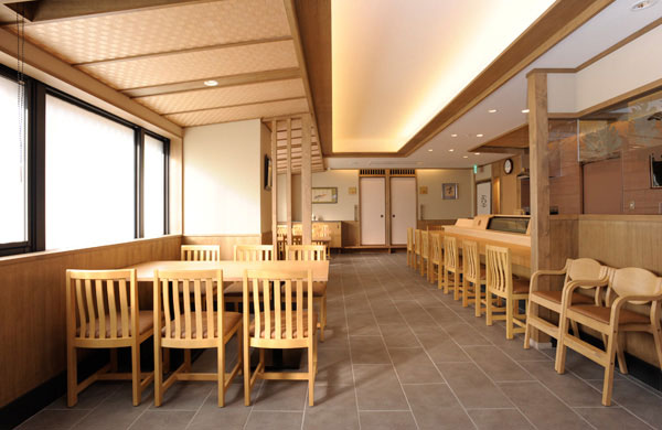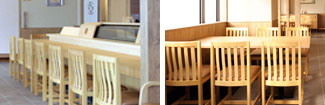 ・カウンター席:60年前から旧店舗で使用してきた桧の一枚板のカウンター。風格は全く変わりません。