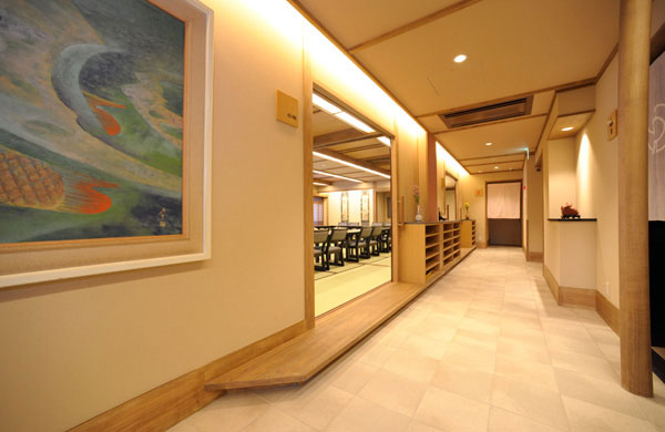 絵画や飾り石もお楽しみいただける二階廊下は、ゆったりとご移動いただけるよう広く幅をとりました。お靴を履いたままで二階までお上がりいただき、お部屋入り口で落ち着いて脱ぎ履きいただけます。